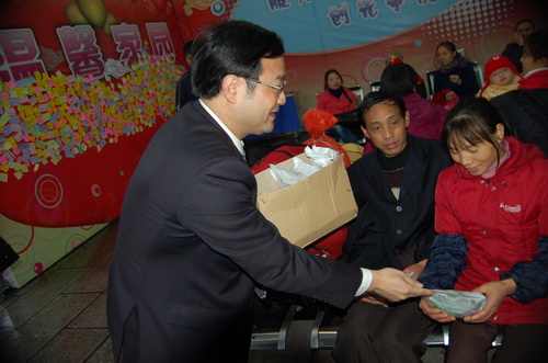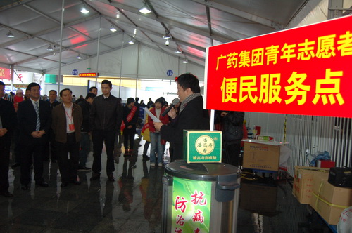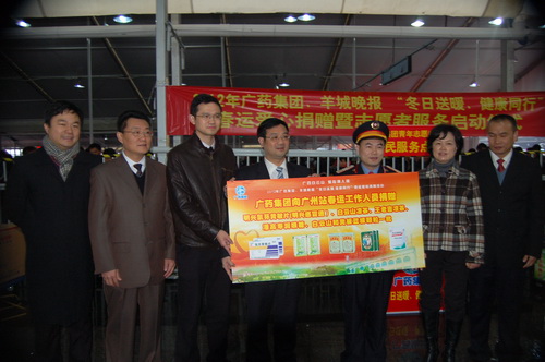 為了配合做好2012年春運工作,《羊城晚報》與廣藥集團共同在廣州火車站啟動了春運現場志愿者服務活動。元月15日上午,《羊城晚報》總編輯劉海陵等領導和白云山和黃中藥、潘高壽、王老吉、明興等企業領導等一行來到廣州火車站,針對車站工作人員在春運期間喊話多、休息少等狀況特別挑選了價值逾10萬元白云山板藍根、白云山涼茶、潘高壽潤喉糖、王老吉涼茶、清開靈膠囊等廣藥集團司屬產品。這些急需藥品、飲料,受到車站領導和工作人員的熱烈歡迎。