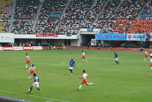 4月6日下午,客場以3比1戰(zhàn)績對武漢取得中超首戰(zhàn)開門紅廣要隊作客深圳迎戰(zhàn)深圳香雪隊。一貫全力支持子弟兵廣藥隊的星群、潘高壽公司再度組成100多人的助威團(tuán),在黨委書記鄭楠的帶領(lǐng)下遠(yuǎn)赴深圳為廣藥隊吶喊助威。上半場雙方難分難解都沒有取得進(jìn)球,下半場外援何塞為廣藥隊取得領(lǐng)先,深圳隊在第86分鐘依靠袁琳的進(jìn)球?qū)⒈确职?SPAN lang=EN-US>平,最終雙方以1比1握手言歡。