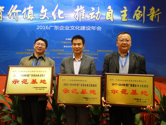 2017年3月26日,以“培育價值文化,推動自主創新”為主題的2016廣東企業文化建設年會在珠海召開。大會總結了廣東省2016年提升企業文化價值引領、推動自主創新的新經驗、新成果,探索新時期開創企業文化建設新境界、加快企業轉型發展的新模式,為廣東省更好地實施創新驅動發展戰略提供了強大的文化驅動力。開幕式上,廣藥集團、和記黃埔中藥、潘高壽等企業獲授“廣東省企業文化建設示范基地”榮譽稱號。潘高壽黨委書記蘇廣豐代表公司上臺領取牌匾。